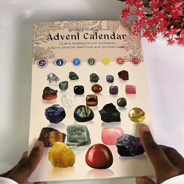 You’ll discover 24 unique gems like Amethyst, Rose Quartz, Citrine, Tiger’s Eye, and more — each with a meaning card for easy reference.